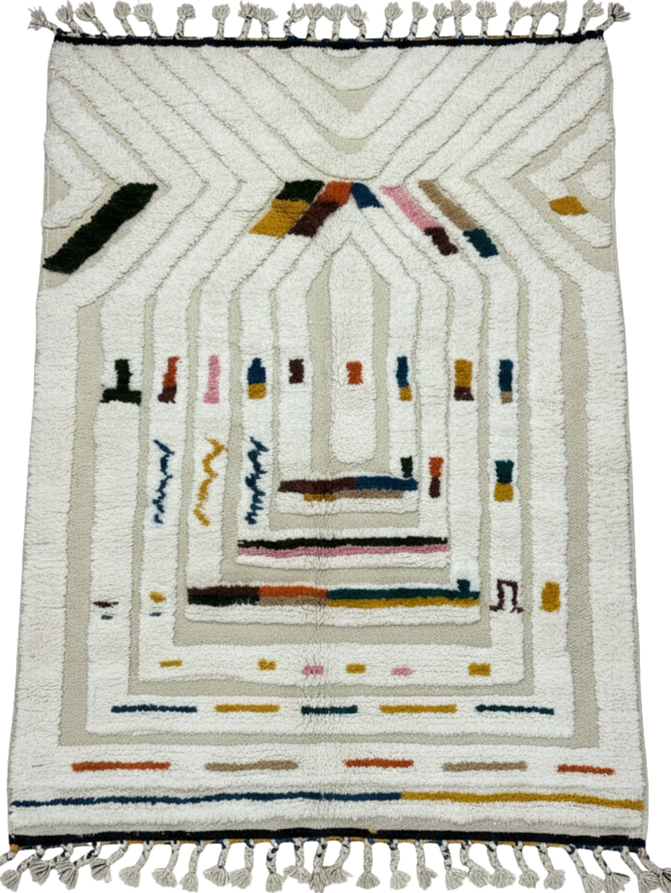 This handmade Moroccan rug is crafted from 100% natural wool and showcases a clean, modern geometric design inspired by contemporary aesthetics.