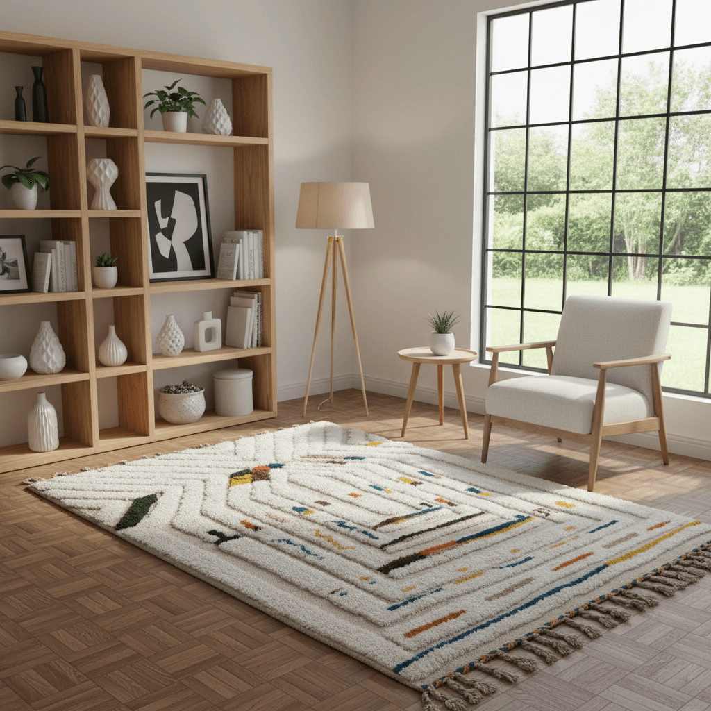 The layered geometric patterns and soft neutral tones are enhanced with delicate colorful details, creating a calm yet artistic look that blends effortlessly with modern, Scandinavian, and minimalist décor.
